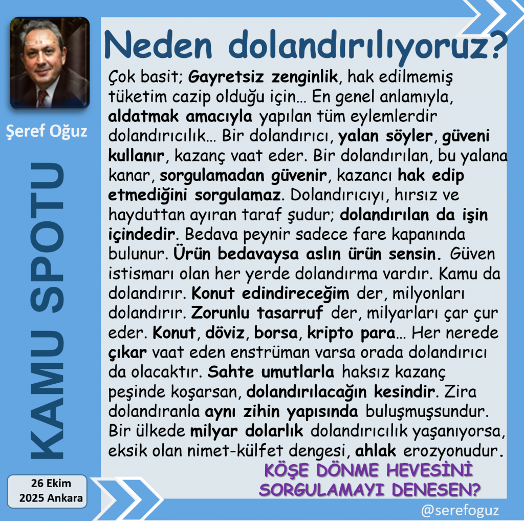 Bir ülkede milyar dolarlık dolandırıcılık yaşanıyorsa, eksik olan nimet-külfet dengesi, ahlak erozyonudur.