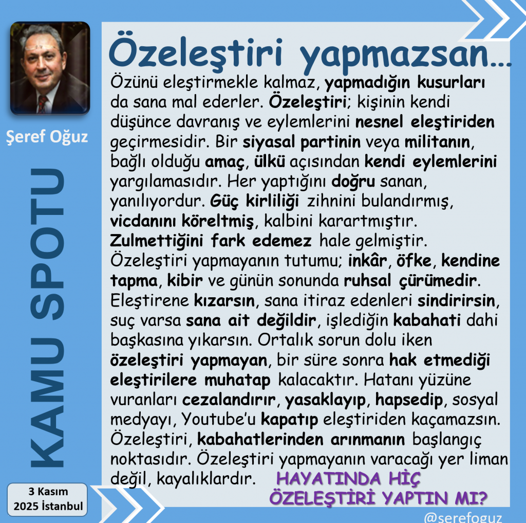 Ortalık sorun dolu iken özeleştiri yapmayan, bir süre sonra hak etmediği eleştirilere muhatap kalacaktır.