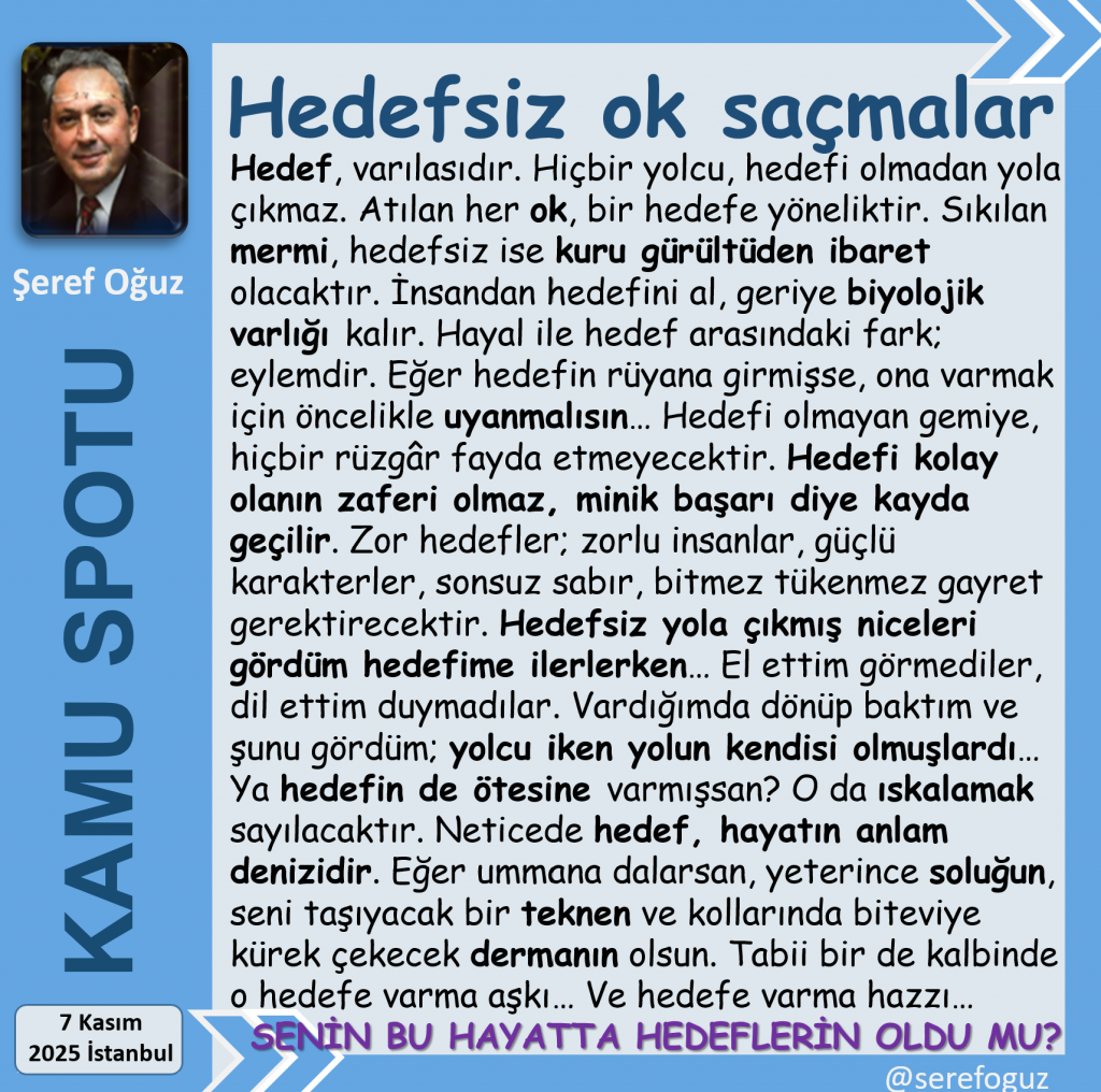 Atılan her ok, bir hedefe yöneliktir. Sıkılan mermi, hedefsiz ise kuru gürültüden ibaret olacaktır.