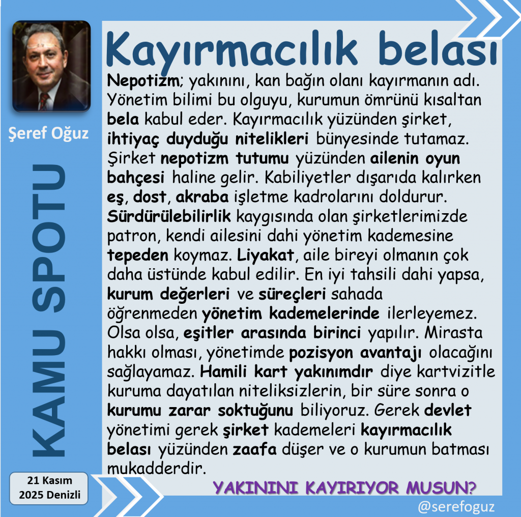 Gerek devlet yönetimi gerek şirket kademeleri kayırmacılık belası yüzünden zaafa düşer ve o kurumun batması mukadderdir.