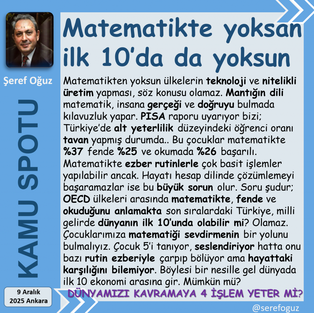 Soru şudur; OECD ülkeleri arasında matematikte, fende ve okuduğunu anlamakta son sıralardaki Türkiye, milli gelirde dünyanın ilk 10’unda olabilir mi?