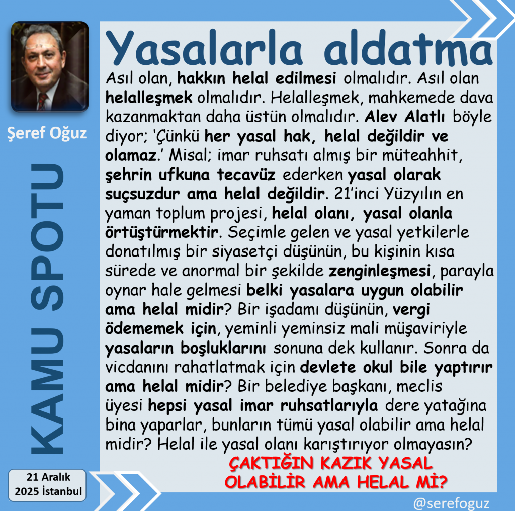 Misal; imar ruhsatı almış bir müteahhit, şehrin ufkuna tecavüz ederken yasal olarak suçsuzdur ama helal değildir.