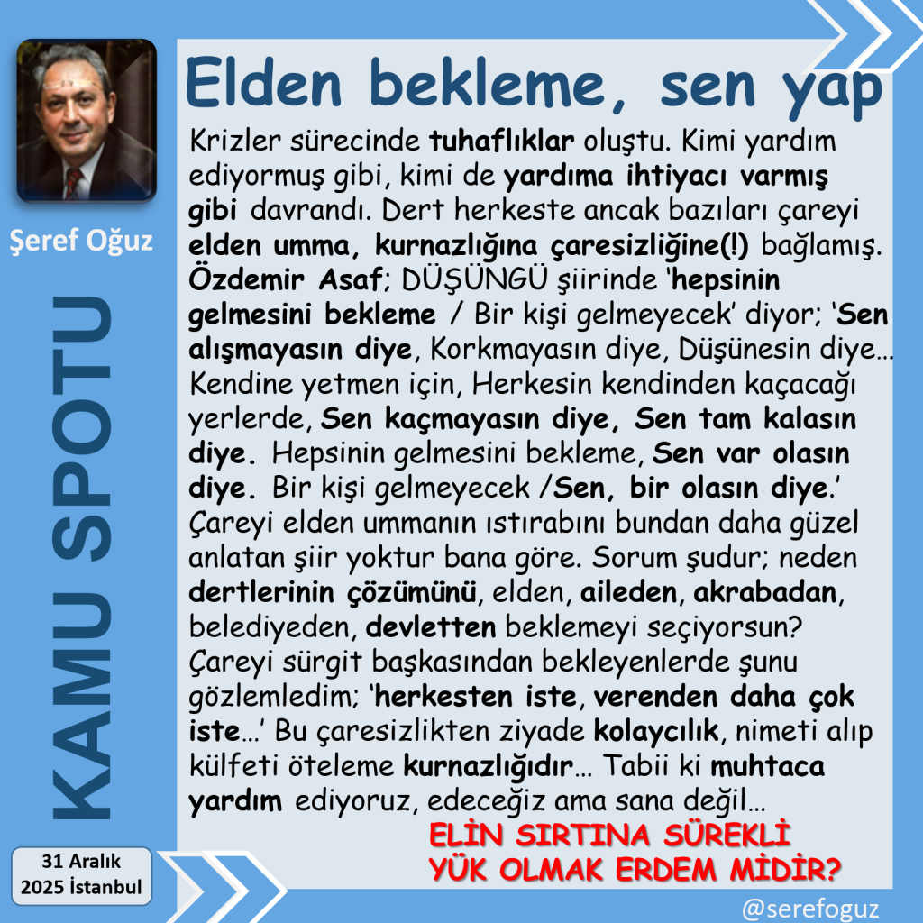 Sorum şudur; neden dertlerinin çözümünü, elden, aileden, akrabadan, belediyeden, devletten beklemeyi seçiyorsun?