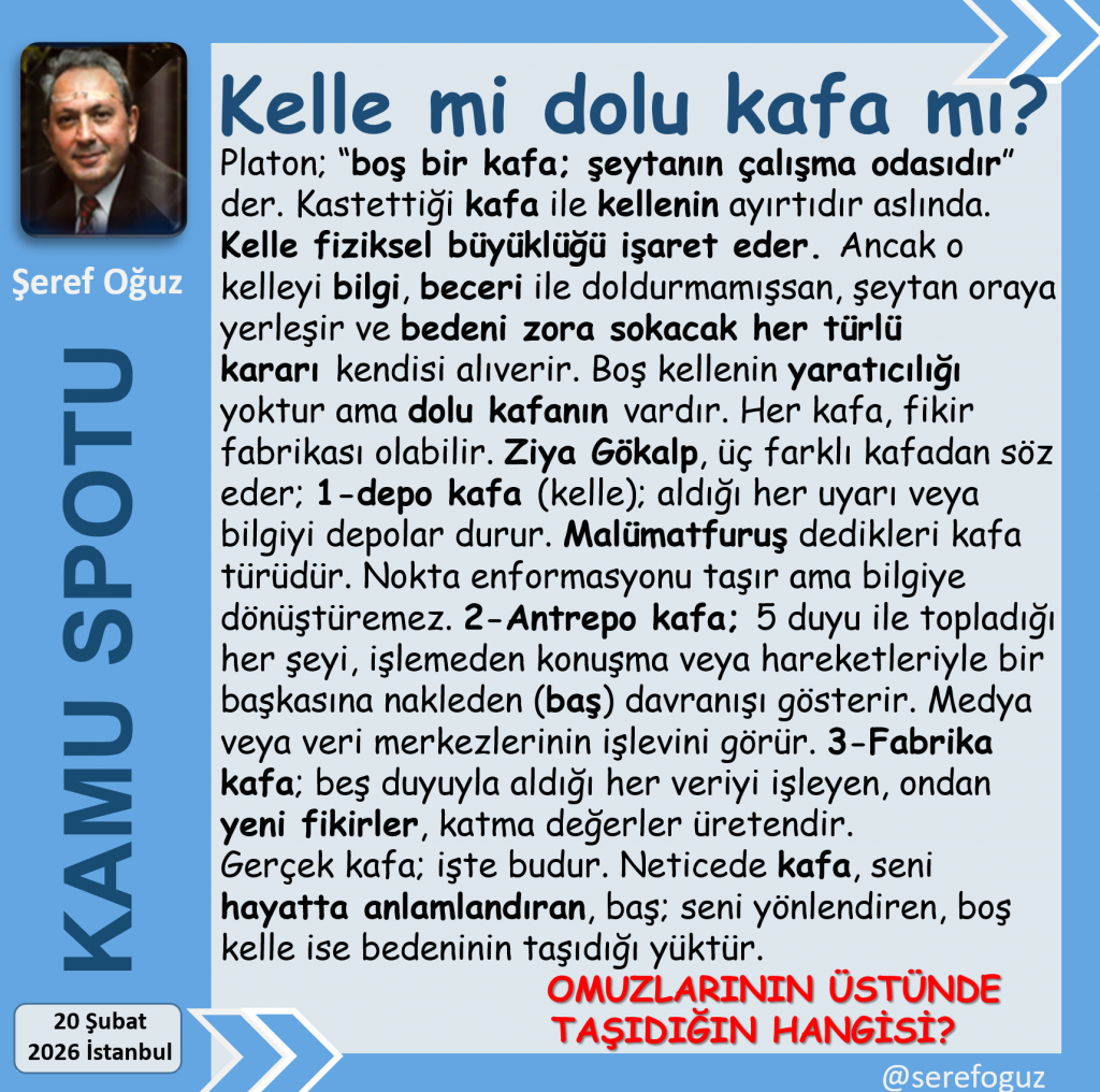 Neticede kafa, seni hayatta anlamlandıran, baş; seni yönlendiren, boş kelle ise bedeninin taşıdığı yüktür.