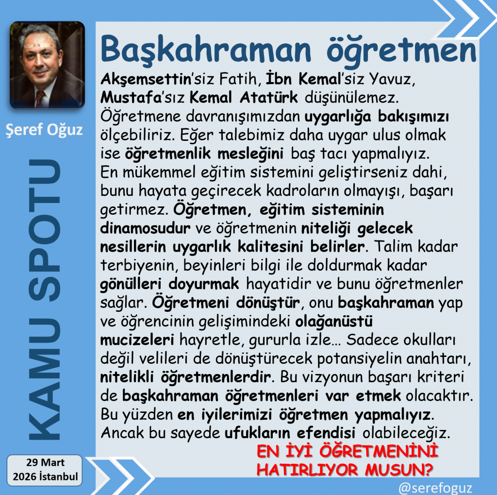 Öğretmen, eğitim sisteminin dinamosudur ve öğretmenin niteliği gelecek nesillerin uygarlık kalitesini belirler.