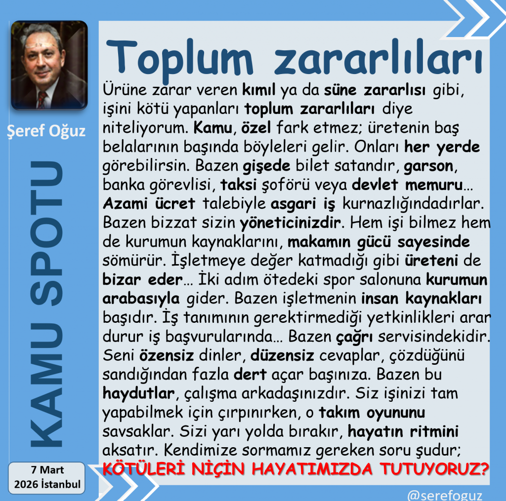 Ürüne zarar veren kımıl ya da süne zararlısı gibi, işini kötü yapanları toplum zararlıları diye niteliyorum.