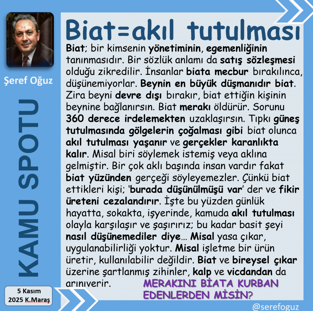 Tıpkı güneş tutulmasında gölgelerin çoğalması gibi biat olunca akıl tutulması yaşanır ve gerçekler karanlıkta kalır.