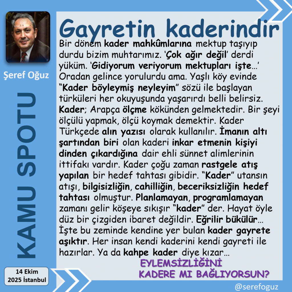 İşte bu zeminde kendine yer bulan kader gayrete aşıktır.