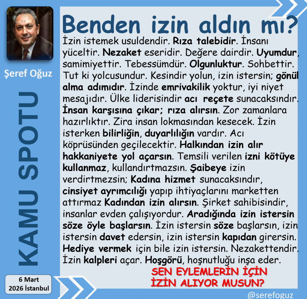 İzin istersin söze başlarsın, izin istersin davet edersin, izin istersin kapıdan girersin.