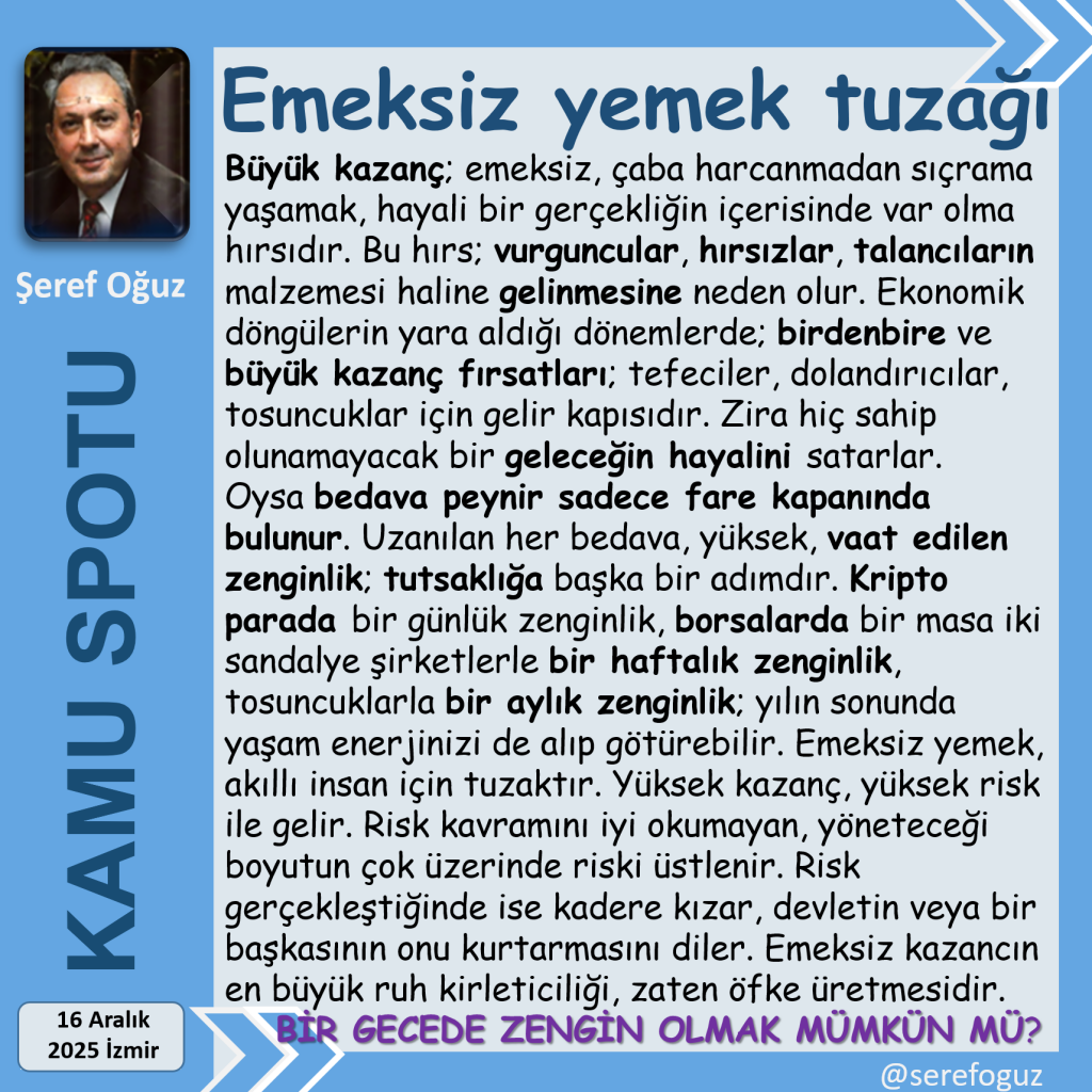 Kripto parada bir günlük zenginlik, borsalarda bir masa iki sandalye şirketlerle bir haftalık zenginlik, tosuncuklarla bir aylık zenginlik; yılın sonunda yaşam enerjinizi de alıp götürebilir.