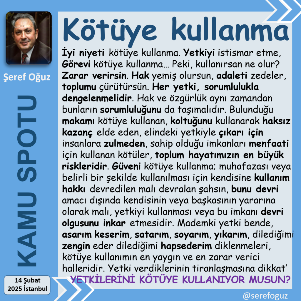 Mademki yetki bende, asarım keserimsatarımsoyarımyıkarım, dilediğimi zengin eder dilediğimi hapsederim diklenmeleri, kötüye kullanımın en yaygın ve en zarar verici halleridir.