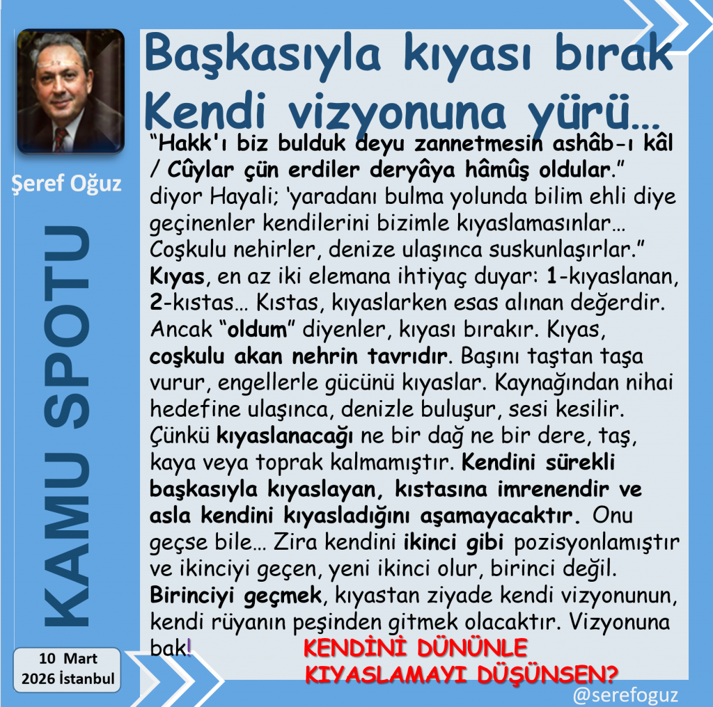 Kendini sürekli başkasıyla kıyaslayan, kıstasına imrenendir ve asla kendini kıyasladığını aşamayacaktır.