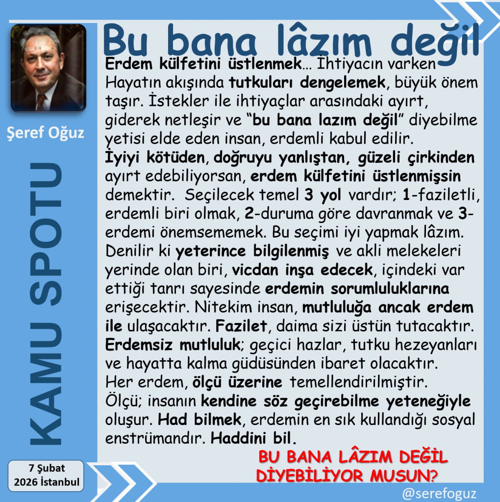 İstekler ile ihtiyaçlar arasındaki ayırt, giderek netleşir ve “bu bana lazım değil” diyebilme yetisi elde eden insan, erdemli kabul edilir.