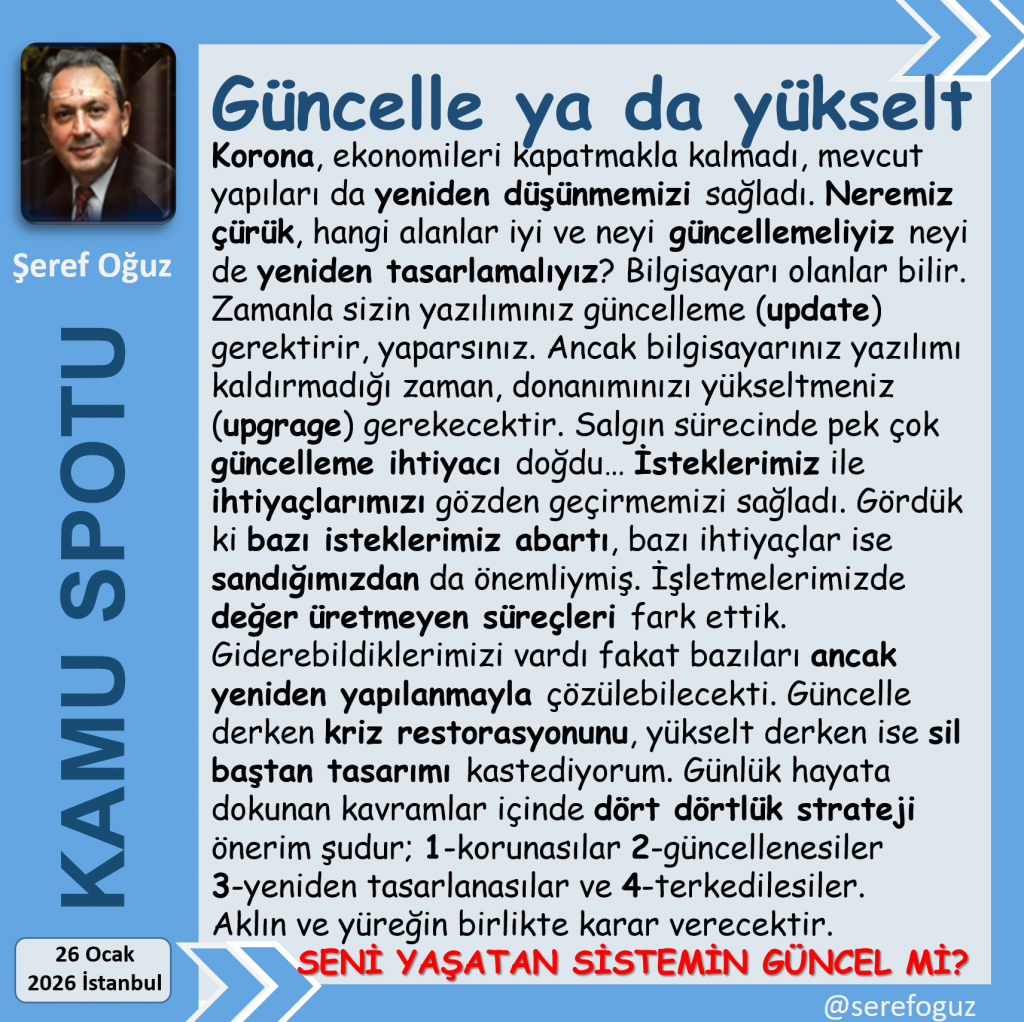 Güncelle derken kriz restorasyonunu, yükselt derken ise sil baştan tasarımı kastediyorum.