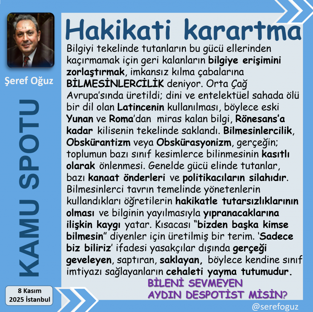 Bilgiyi tekelinde tutanların bu gücü ellerinden kaçırmamak için geri kalanların bilgiye erişimini zorlaştırmak, imkansız kılma çabalarına BİLMESİNLERCİLİK deniyor.