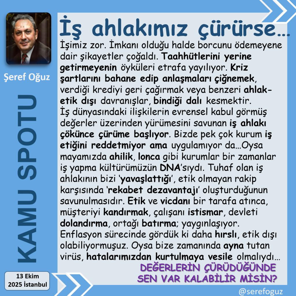 İş dünyasındaki ilişkilerin evrensel kabul görmüş değerler üzerinden yürümesini savunan iş ahlakı çökünce çürüme başlıyor.