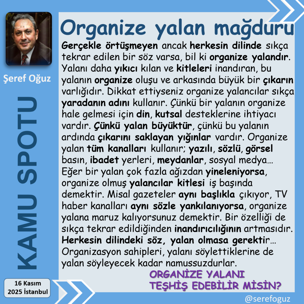 Yalanı daha yıkıcı kılan ve kitleleri inandıran, bu yalanın organize oluşu ve arkasında büyük bir çıkarın varlığıdır.