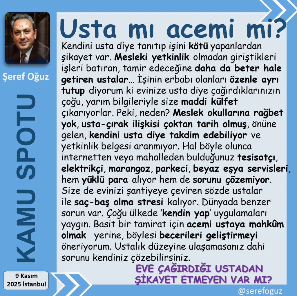İşinin erbabı olanları özenle ayrı tutup diyorum ki evinize usta diye çağırdıklarınızın çoğu, yarım bilgileriyle size maddi külfet çıkarıyorlar.