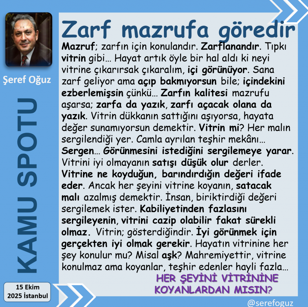 Her şeyini vitrinine koyanın satacak malı azalmış demektir. Sonuçta zarf, mazrufa göre olmalı…