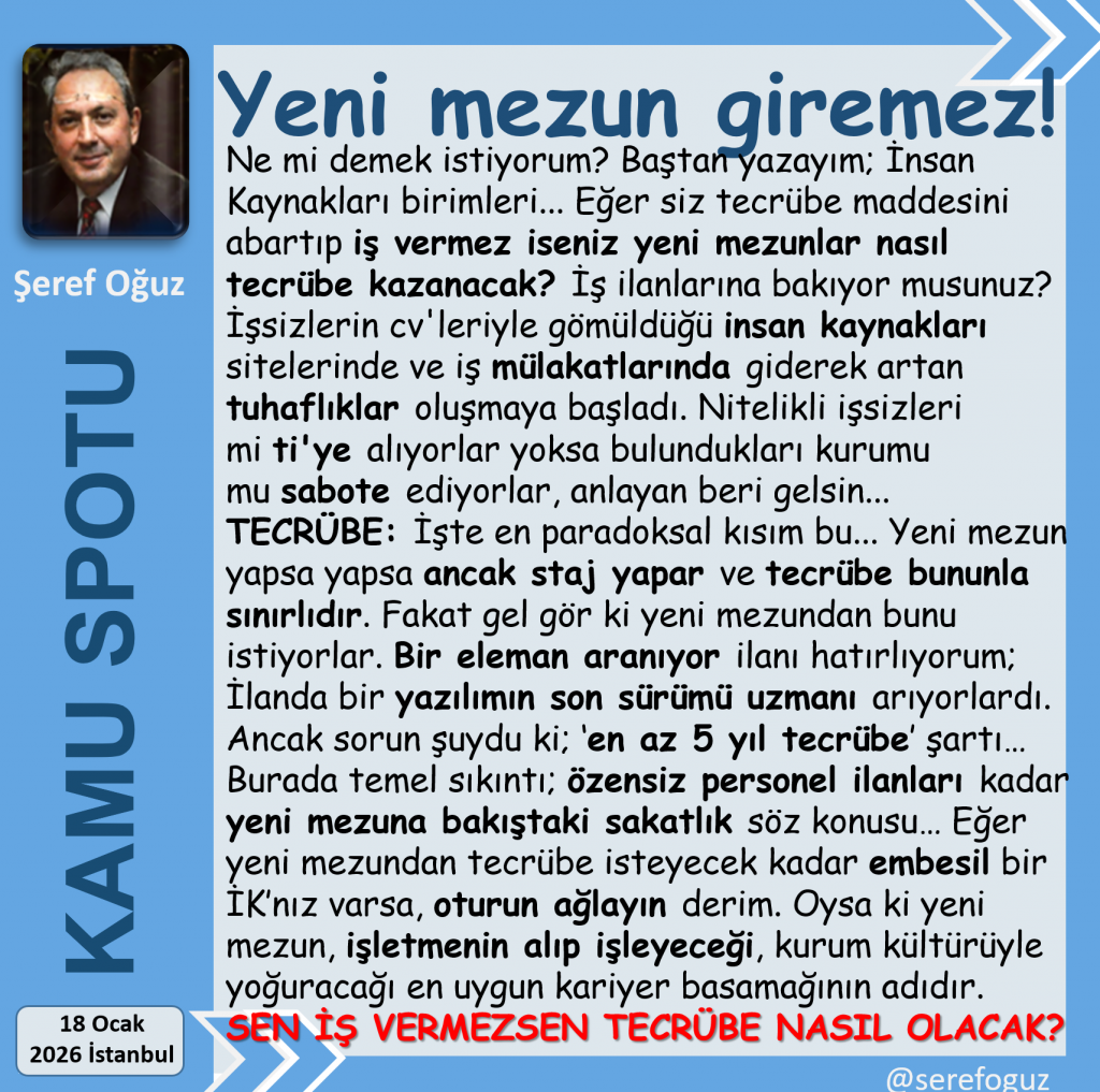 Burada temel sıkıntı; özensiz personel ilanları kadar yeni mezuna bakıştaki sakatlık söz konusu…